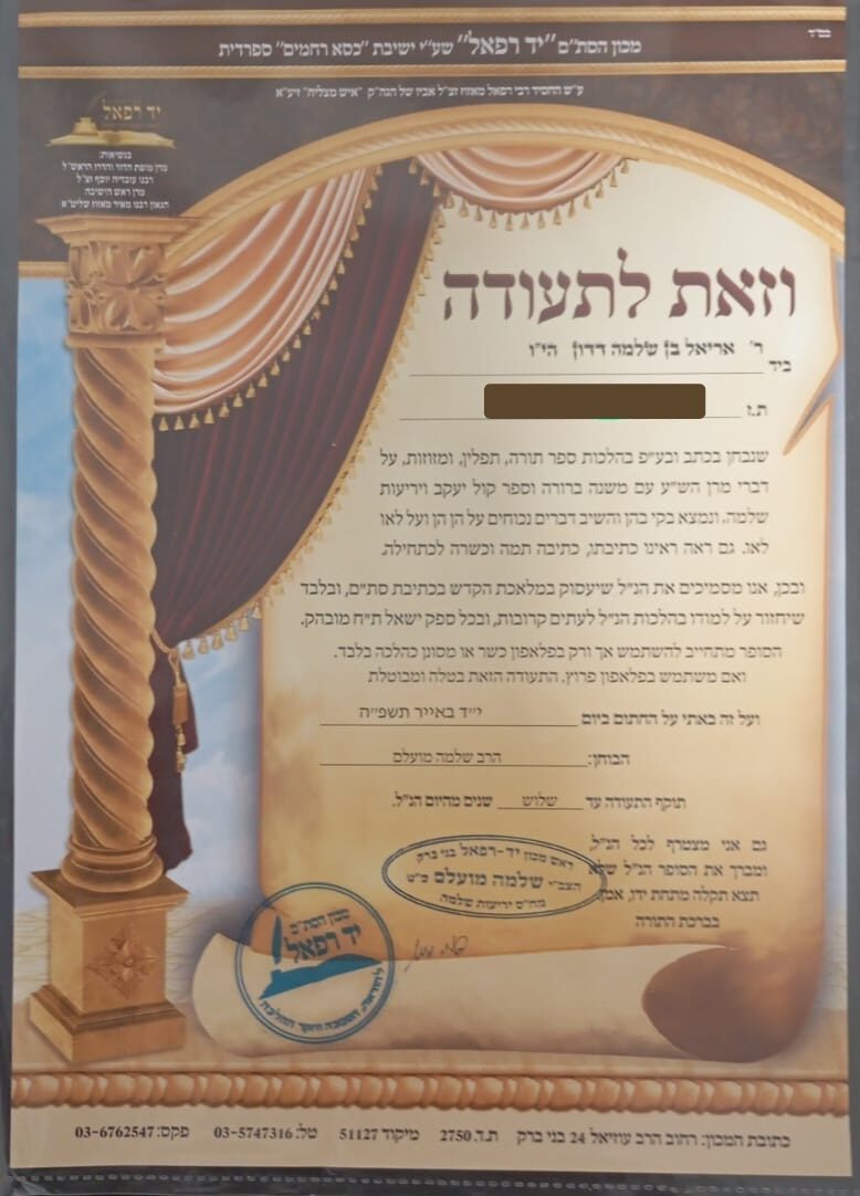 שמי אריאל דדון, ואני סופר סת"ם מוסמך עם מעל 3 שנות ניסיון, המתגורר ועובד בקרית אתא. את הכשרתי המקיפה רכשתי במכון 'כתר ההלכה' וברשותי תעודת הסמכה רשמית מטעם 'יד רפאל' ובתוקף . אני מתמחה בכתיבת מזוזות לפי נוסח ספרד – עדות המזרח.