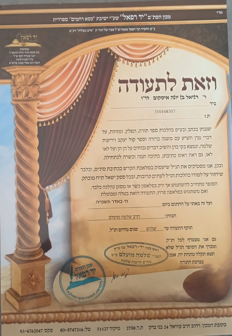 שמי הרב דניאל איסקוב, אברך כולל וסופר סת"ם בעל תעודת הסמכה בתוקף מטעם "יד רפאל" עם ותק של 3 שנים בתחום. חיי מוקדשים לעמלה של תורה, למסירת שיעורים ולזיכוי הרבים, וכשאני ניגש למלאכת הקודש של כתיבת הסת"ם, אני מביא איתי את כל עולמי הרוחני. עבורי, כל אות היא חיבור בין שמיים לארץ, ולכן אני מקפיד לטבול במקווה לפני כל כתיבה. ברגעי הכתיבה אני מתנתק מכל רעשי הרקע, כולי מרוכז, שקוע ודבוק במטרה ללא שום הפרעות. חשוב לי לא רק הפן הרוחני אלא גם הפיזי, ולכן אני מקפיד על אופן כתיבה ייחודי שיחזיק מעמד, ומשתמש אך ורק בחומרי הגלם האיכותיים ביותר ללא שום פשרות, כדי שהמצווה שלכם תהיה מהודרת ושלמה לדורות ארוכים.