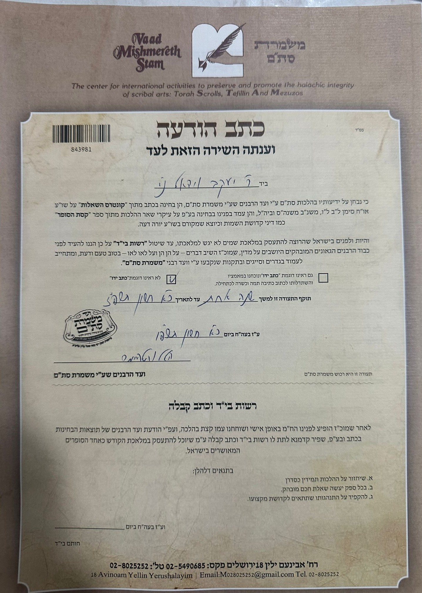 ניתן גם למסור לי סת"ם קיים לבדיקה. אעביר את התפילין והמזוזות למגיה חיצוני מוסמך ומקצועי, ואדאג שתקבלו תוך זמן קצר חזרה תשובה מפורטת ומוסמכת על כשרותם.